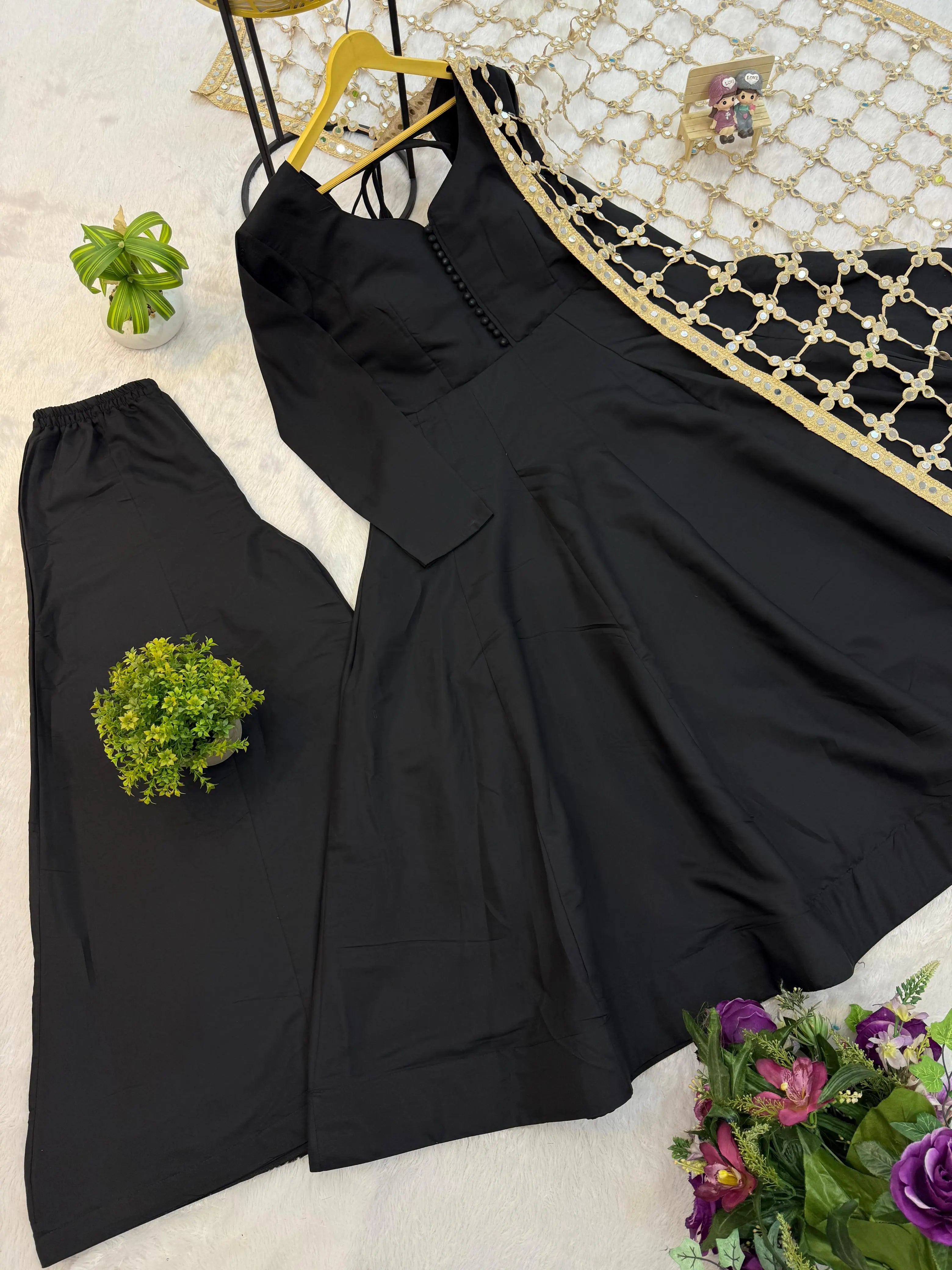 A superhit trending Roman silk set with rich embroidery and real mirror work—designed to make you stand out at every festive and special occasion.