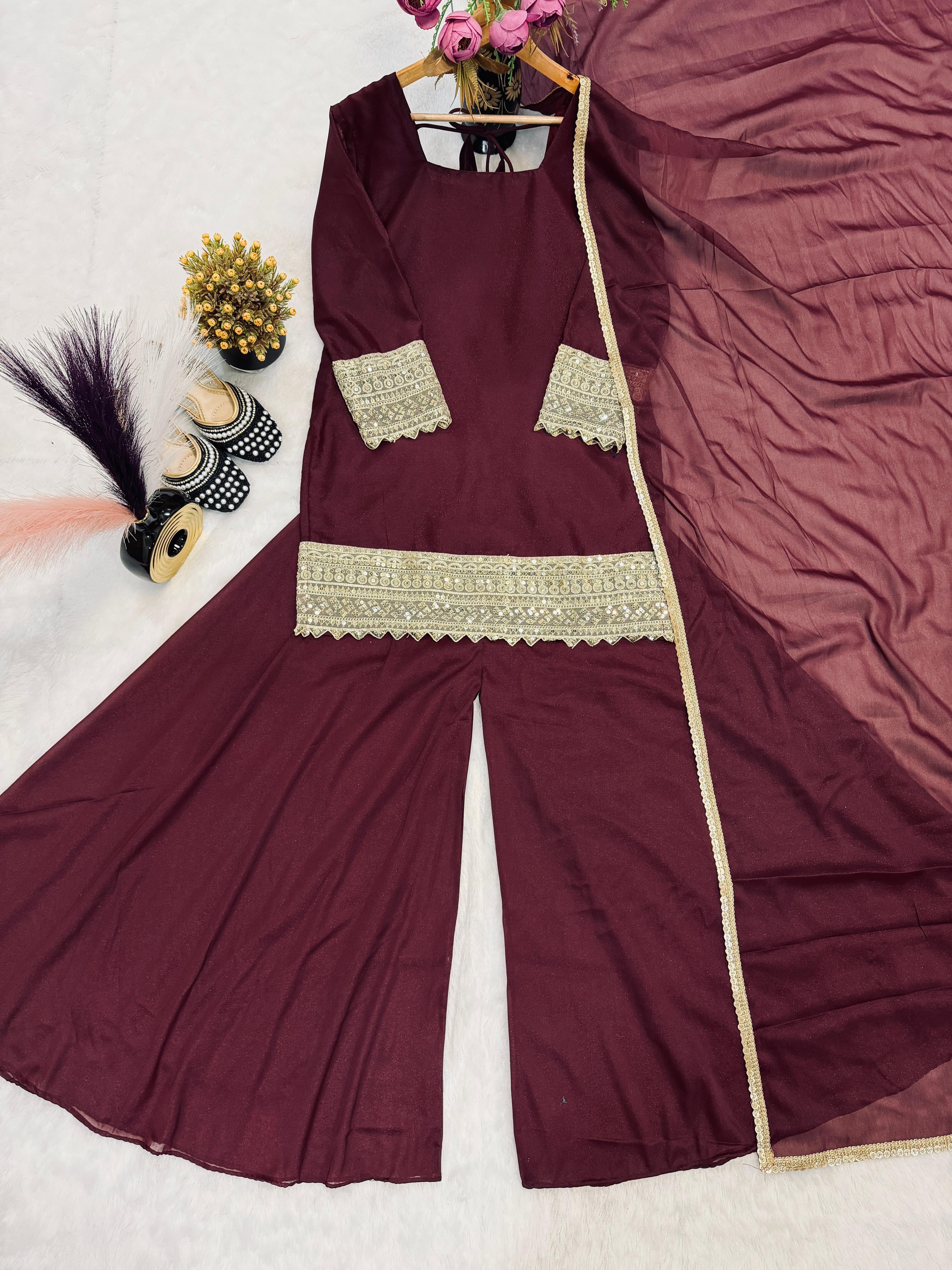 This designer sharara plazo set is crafted in heavy star georgette with premium 5mm embroidery sequence and coding work, giving it a rich festive appeal. The fully stitched top comes with full sleeves and latkan dori detailing, paired with a fully flared sharara plazo for a graceful look. A matching heavy star georgette dupatta with fancy lace border completes the outfit, making it perfect for parties, festive functions, and special occasions.