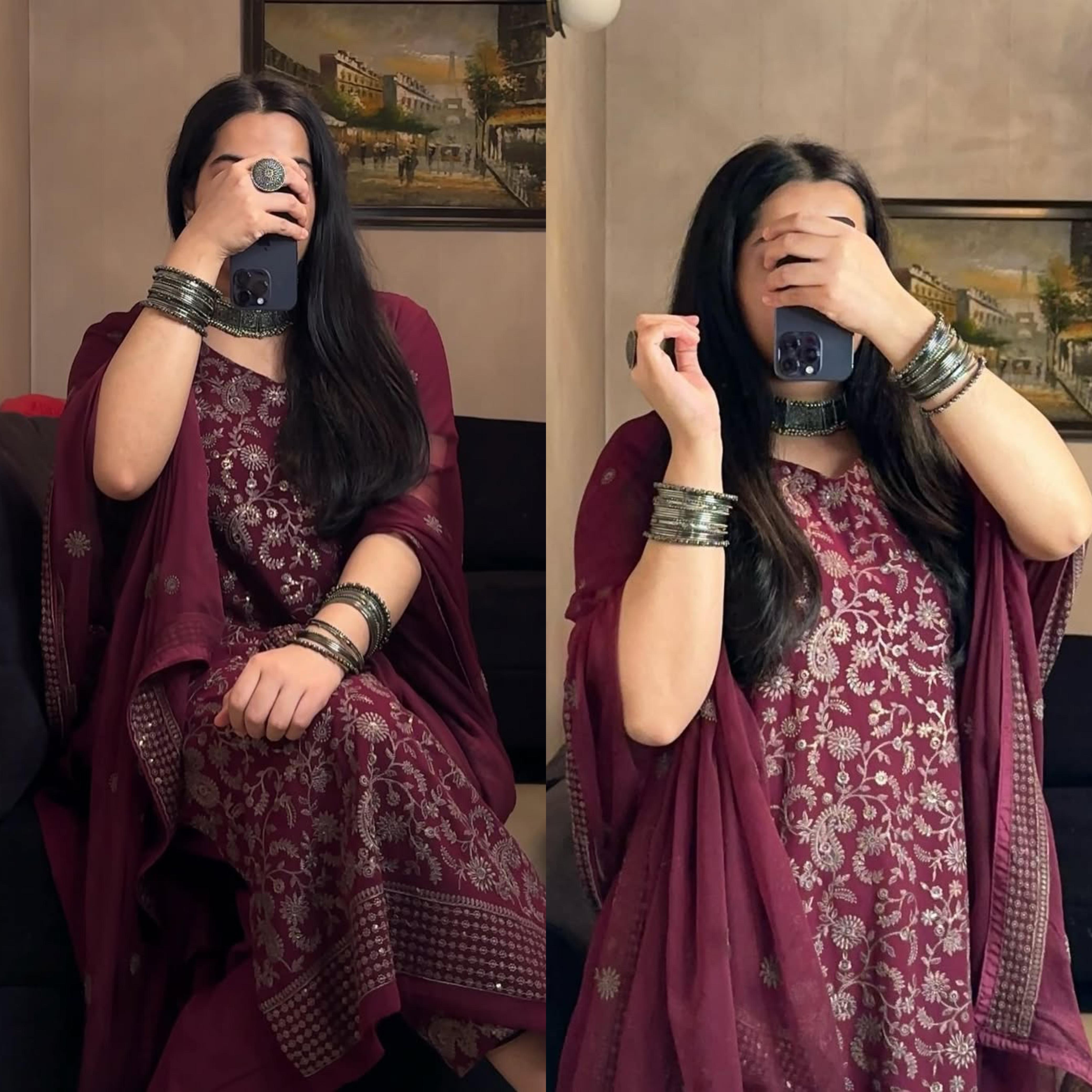 This desirable fancy top pant set is made from premium faux georgette fabric with elegant sequence embroidery work. The top comes with a soft micro inner for comfort and a graceful 48-inch length. The pant is fully stitched for easy wear, and the matching dupatta features sequence embroidery with a 2.3-meter length. Lightweight and stylish, this set is ideal for parties, festive occasions, and semi-formal events.