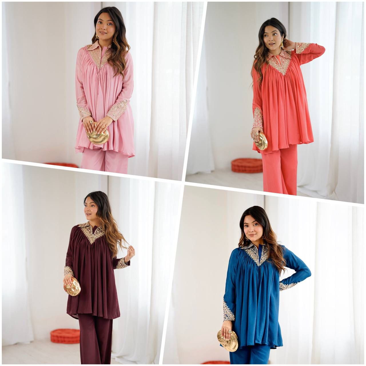 A trendy and comfortable 2-piece cord set, perfect for casual outings, semi-festive occasions, or stylish everyday wear. Includes a well-fitted top and coordinated plazzo, both crafted in heavy Chinon fabric with embroidery and sequence work for a premium finish.