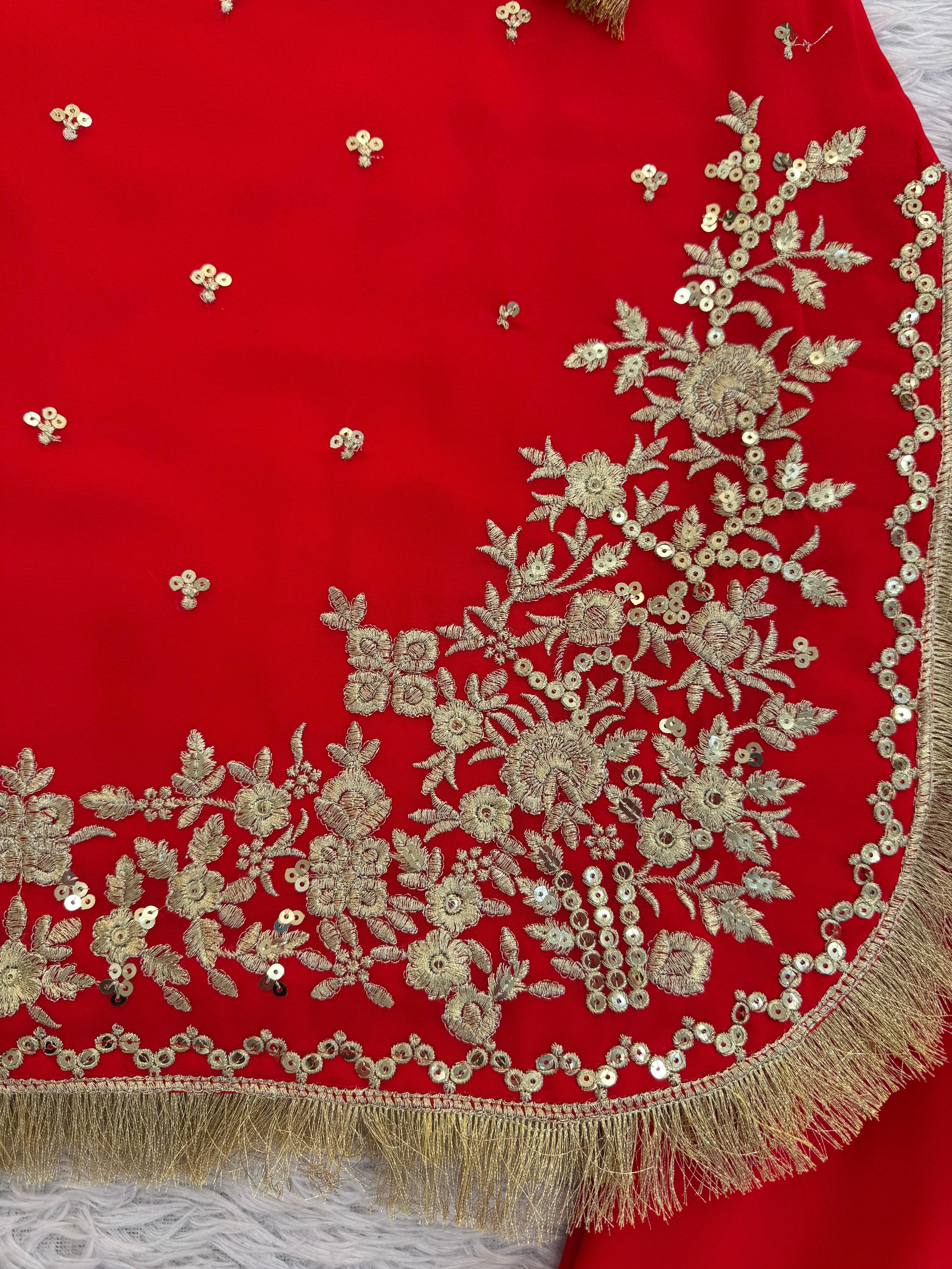 This designer sharara set is crafted in premium C by C faux georgette and finished with elegant thread and sequence work paired with fancy lace detailing. The top comes with a soft micro cotton lining for comfort, while the fully stitched sharara features an elastic waistband for an easy and flattering fit.