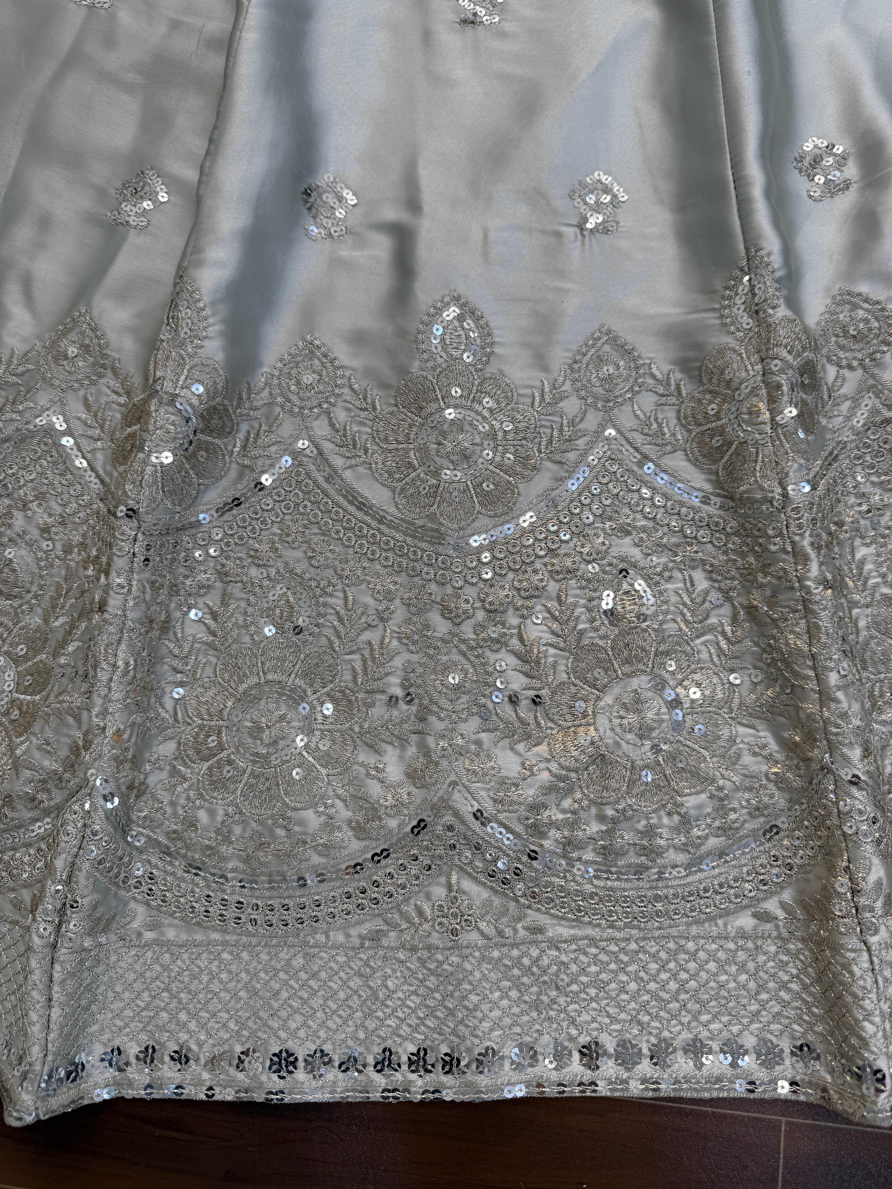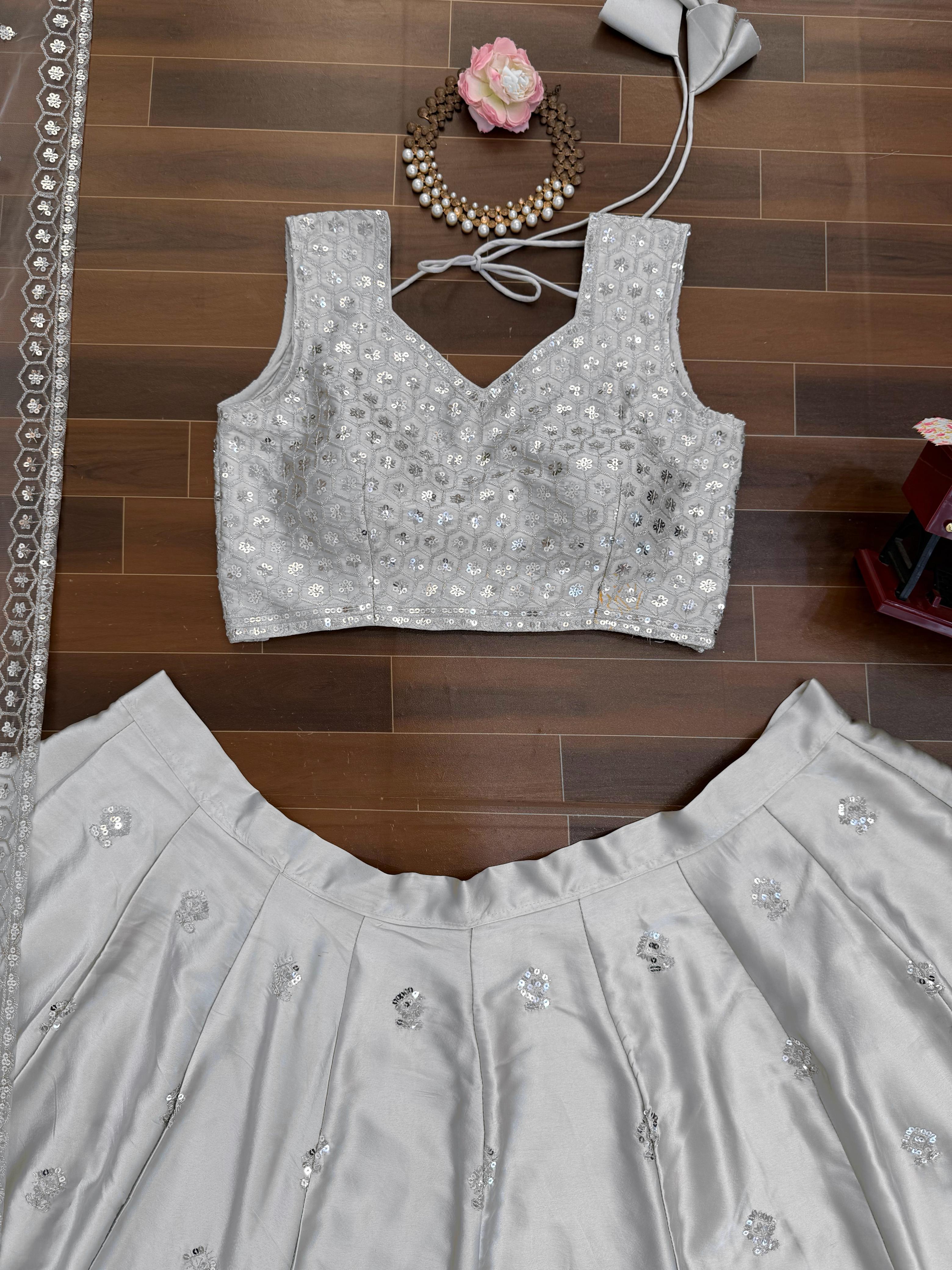 Lehenga: Japan satin with thread & sequence work, soft micro lining, cancan with canvas (Fully stitched)