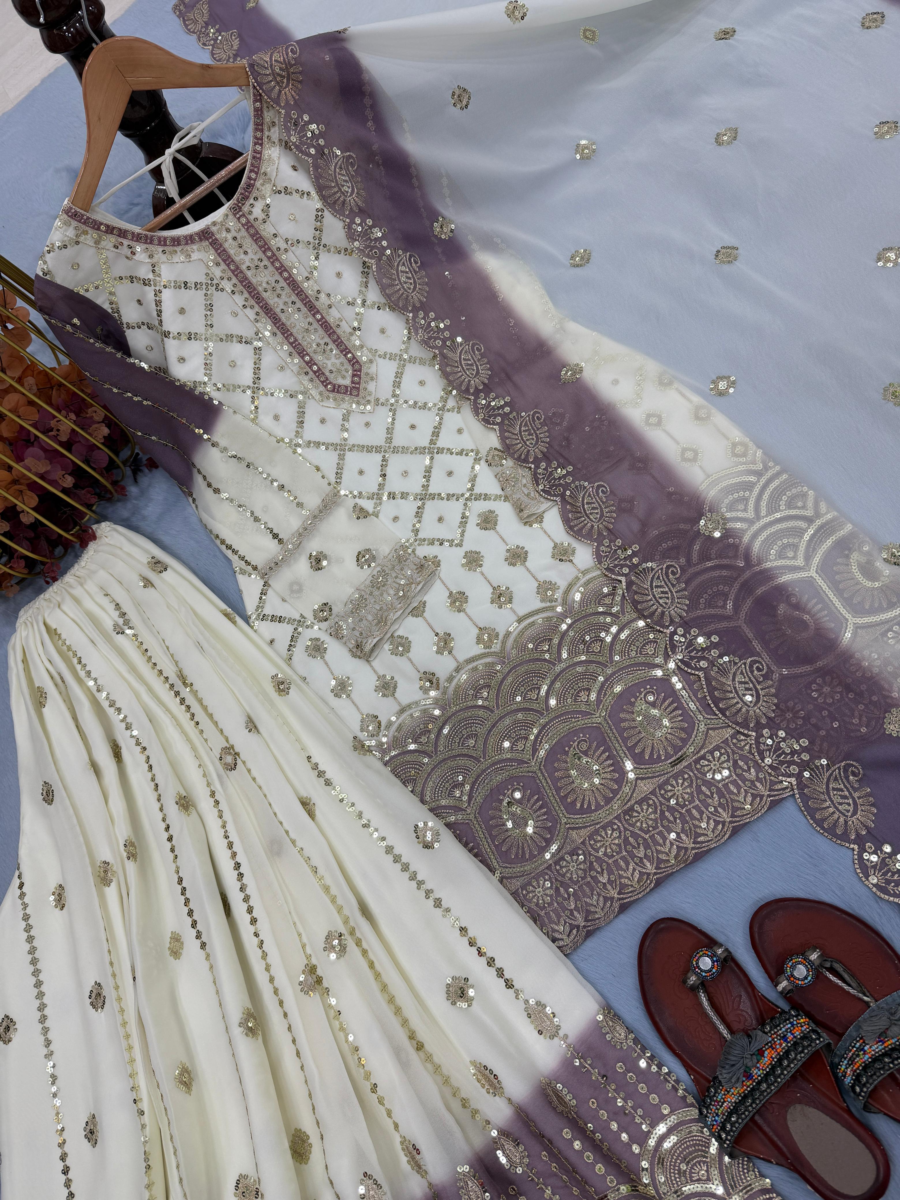 This designer party wear set is crafted in pure heavy dual tone pending star georgette, featuring elegant 5 mm sequence embroidery work for a rich and stylish look. The top comes fully stitched with sleeves and a soft micro cotton inner for all-day comfort. The matching plazzo is fully stitched with elastic waist and inner lining, offering ease of wear. The look is completed with a beautifully embroidered dupatta with cutwork, making it perfect for parties, festive occasions, and evening functions.