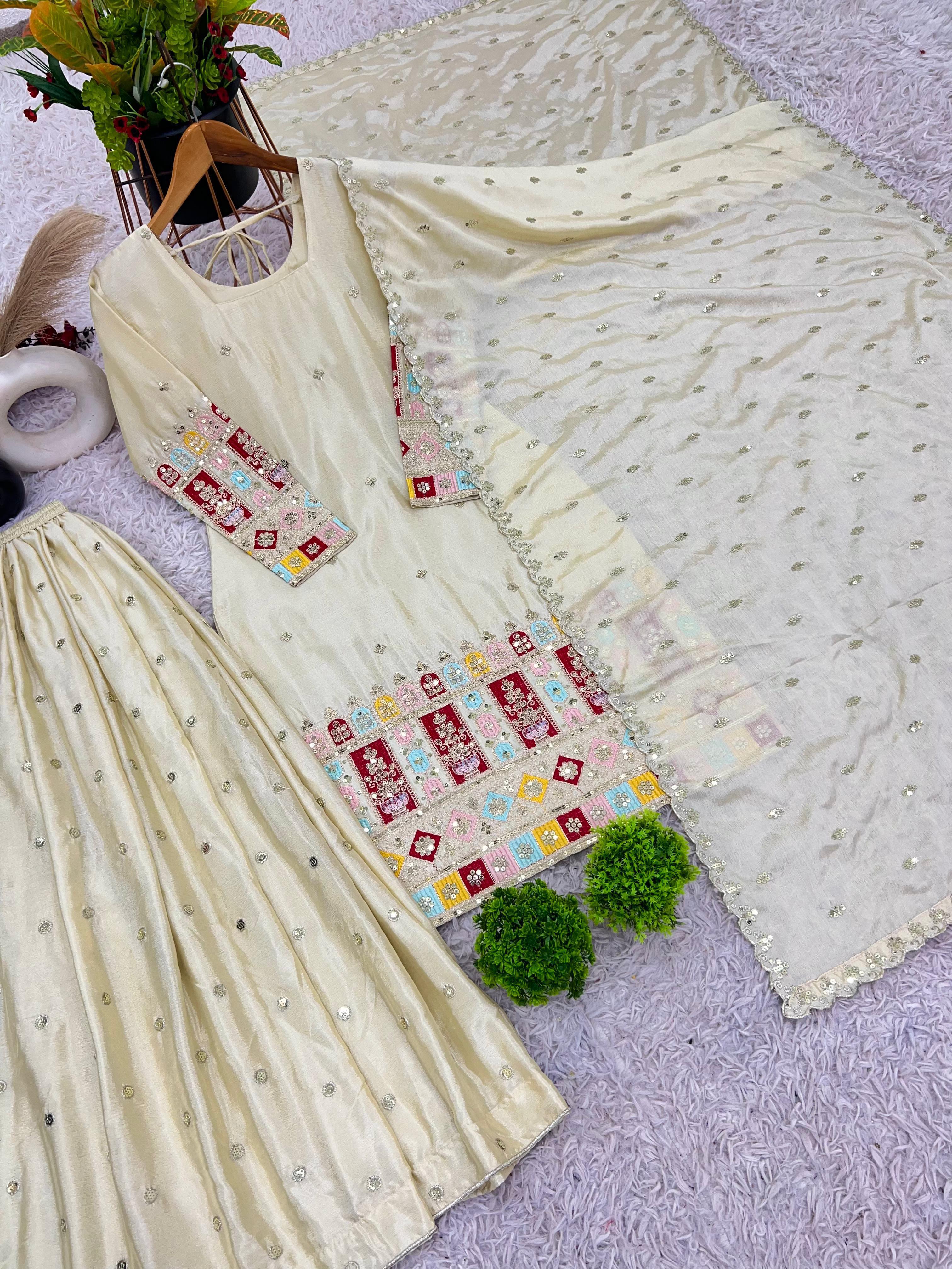 Heavy Embroidery Chinon Silk Top Gharara Dupatta Set