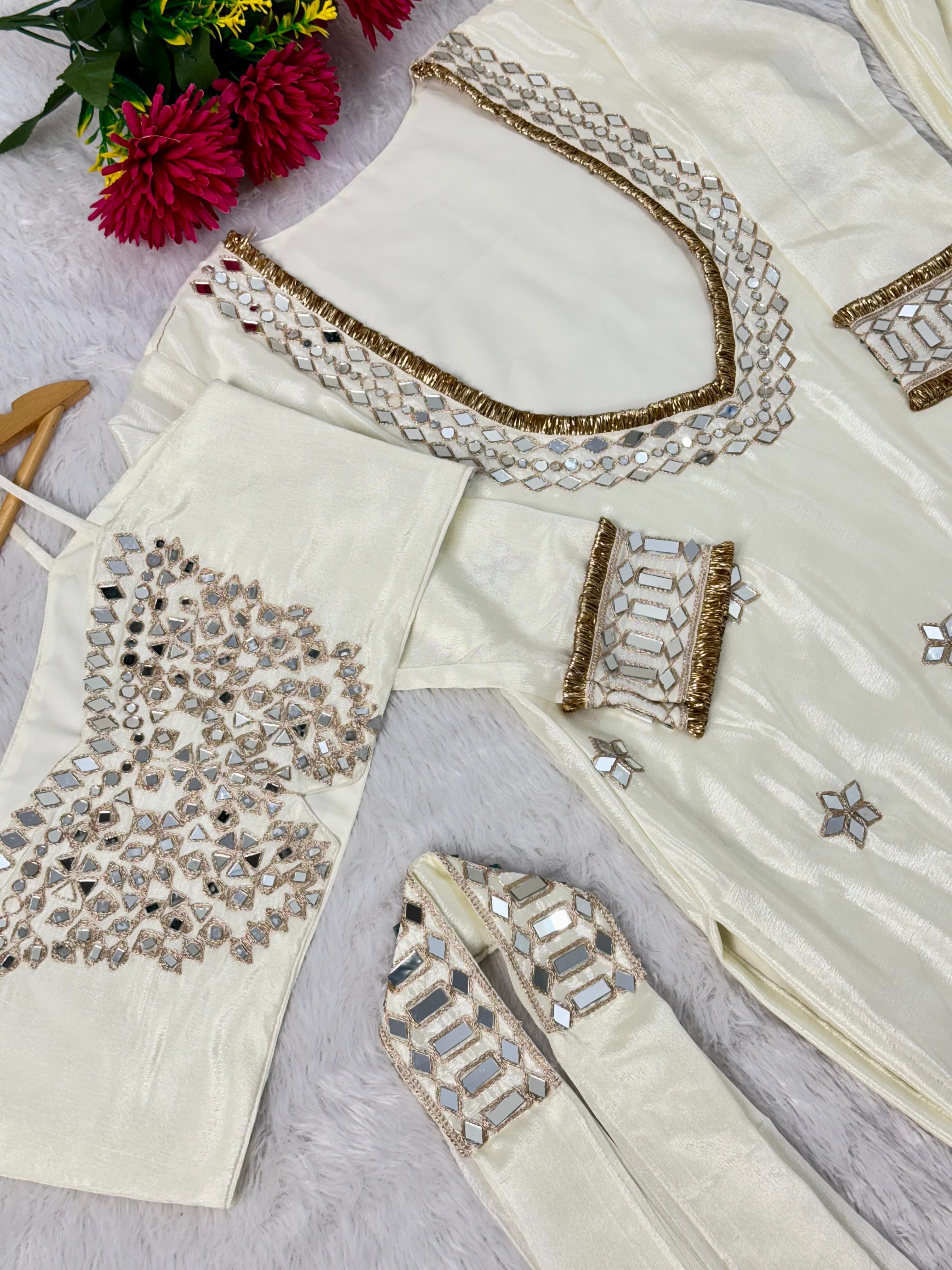 This elegant party wear dress set is crafted in premium Chinon fabric featuring a stylish bustier top with side zip, flared plazo, and a matching dupatta with crepe lining. The outfit is beautifully enhanced with thread embroidery, zari work, real mirror detailing, and lace work, giving it a rich festive look. Designed to offer comfort with elegance, this set is perfect for parties, festive events, and special occasions.