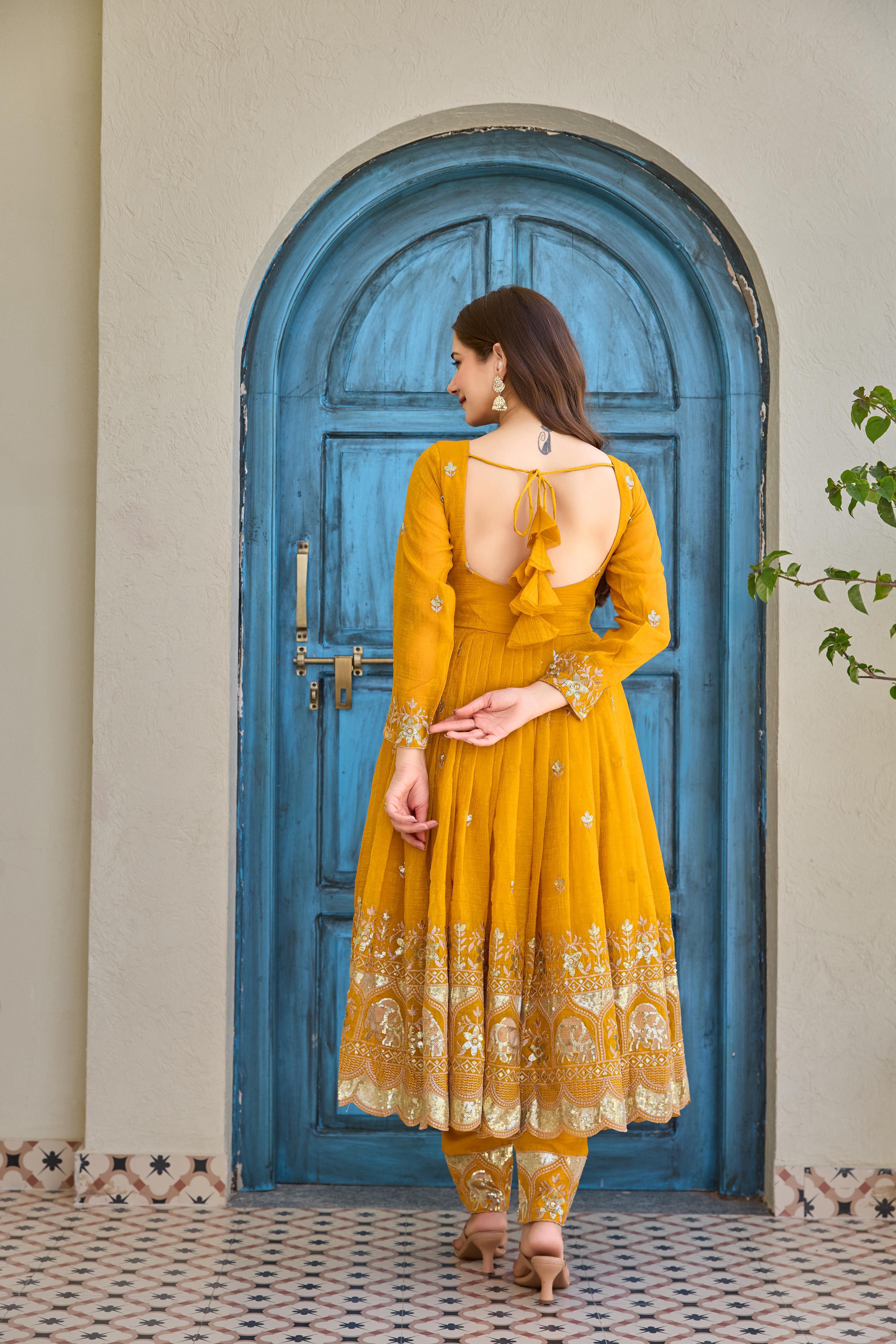 This premium designer Anarkali pant set is crafted in heavy crunchy silk and showcased through our own real-model shoot for an authentic look and feel. The Anarkali features elegant designer embroidery with sequin and thread detailing and comes ready to wear with soft micro inner lining for all-day comfort. The fully stitched pant includes an elastic waistband for easy fitting. A matching crunchy silk dupatta with detailed embroidery completes the look, making it ideal for festive events, parties, and elegant day wear.