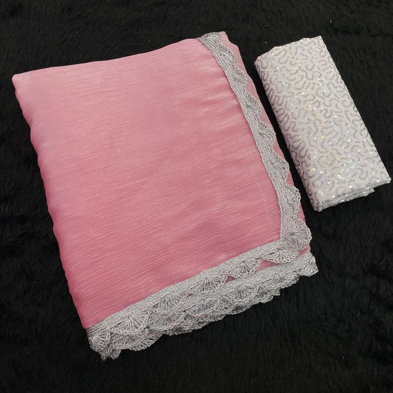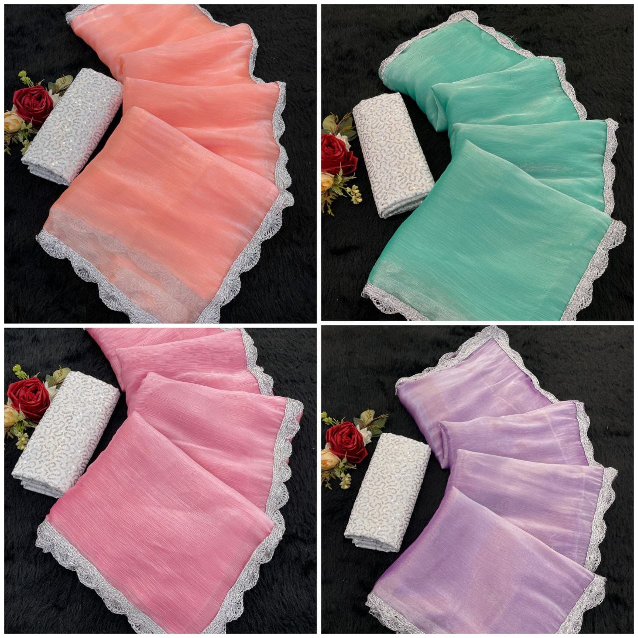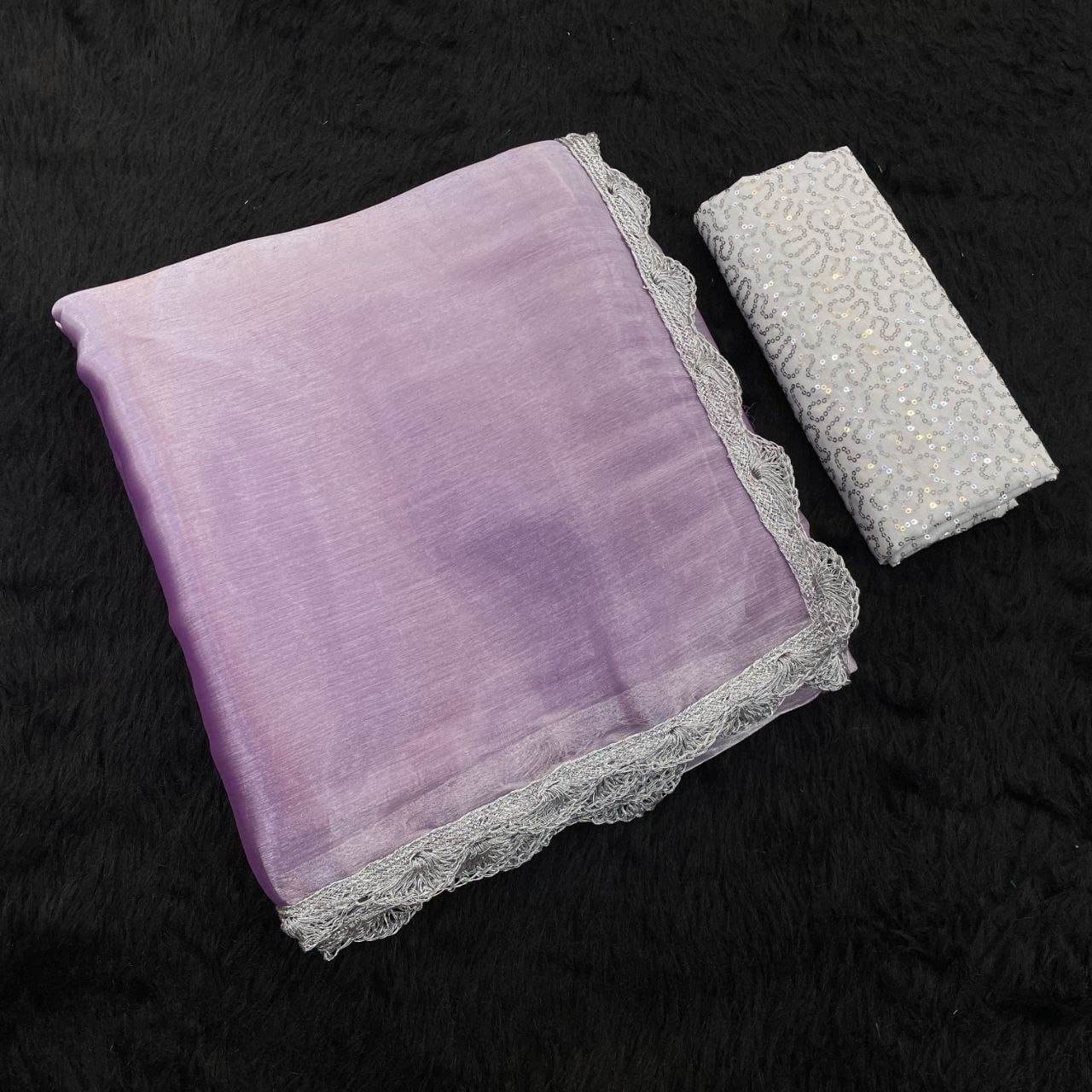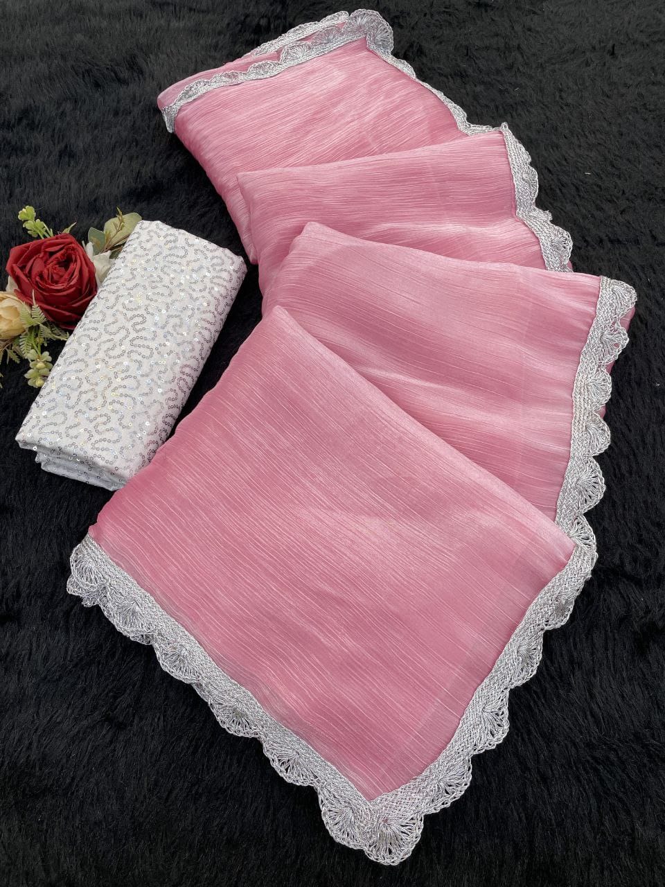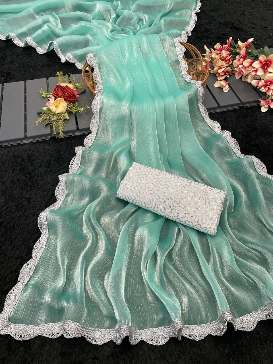 This Bollywood trending saree is crafted in stylish Jimmy Choo fabric with a premium silver lace border, giving a classy and elegant look. Designed for parties and festive occasions, the saree drapes beautifully and comes with a matching blouse featuring sequence embroidery work.
