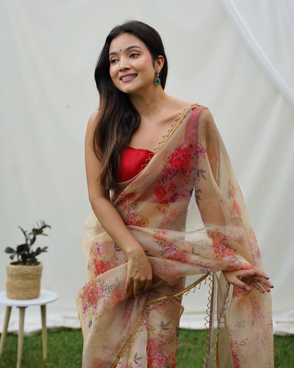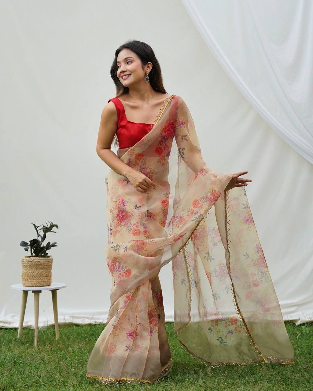 This exclusive pure organza silk saree is designed with a beautiful floral digital print spread elegantly across the saree. It is finished with a premium golden cutdana moti border that adds a subtle festive shine. The saree comes with a matching raw silk plain blouse, making it perfect for parties, festive occasions, and elegant day functions.
