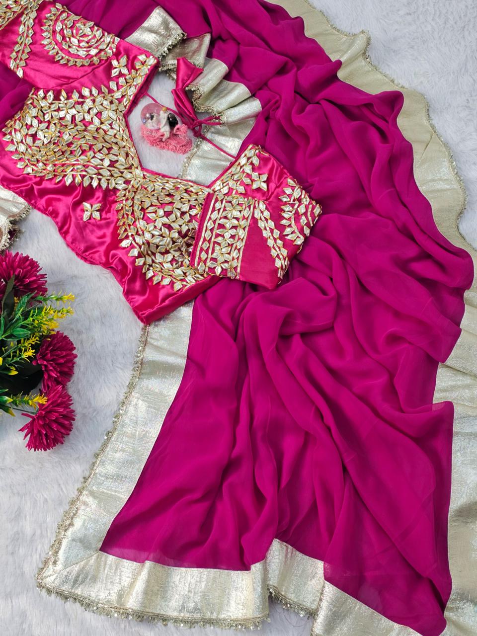 Saree: Soft CC Georgette with 3-inch self-design big gotta patti work and heavy sequence lace border (5.5 meters)