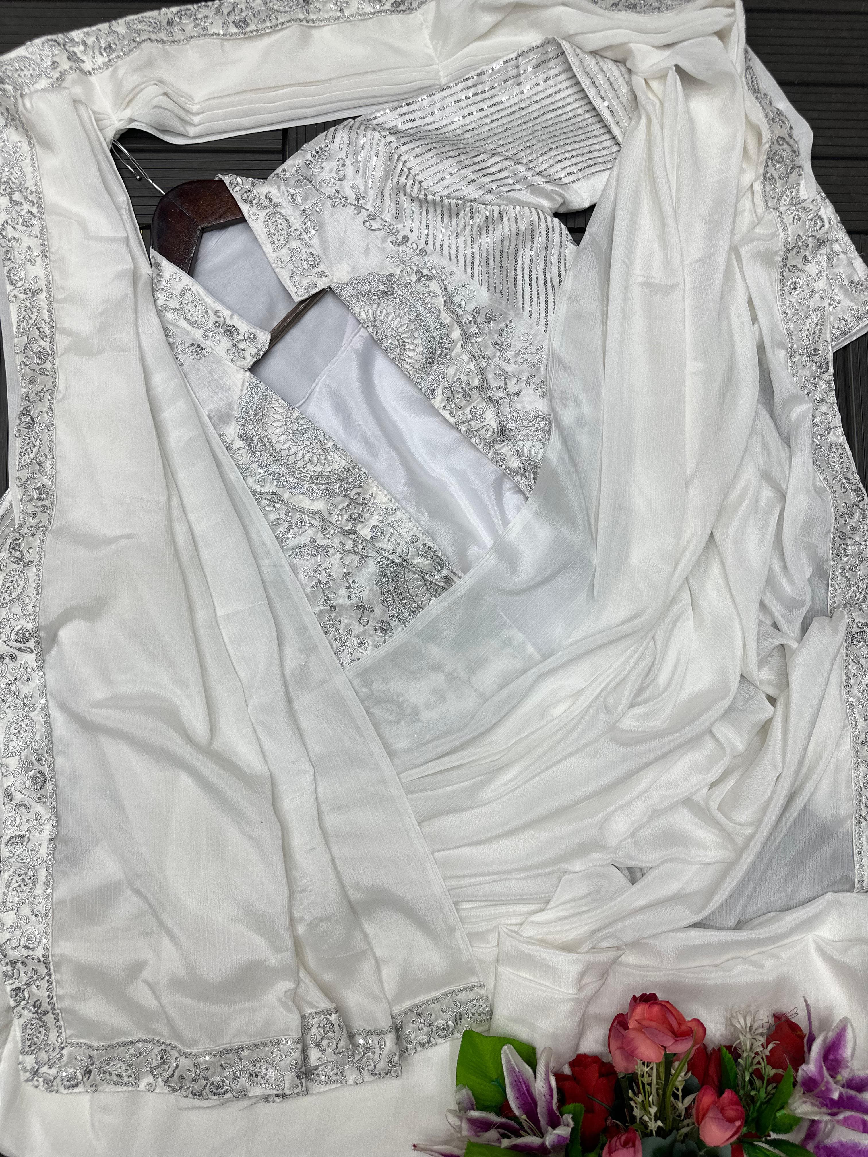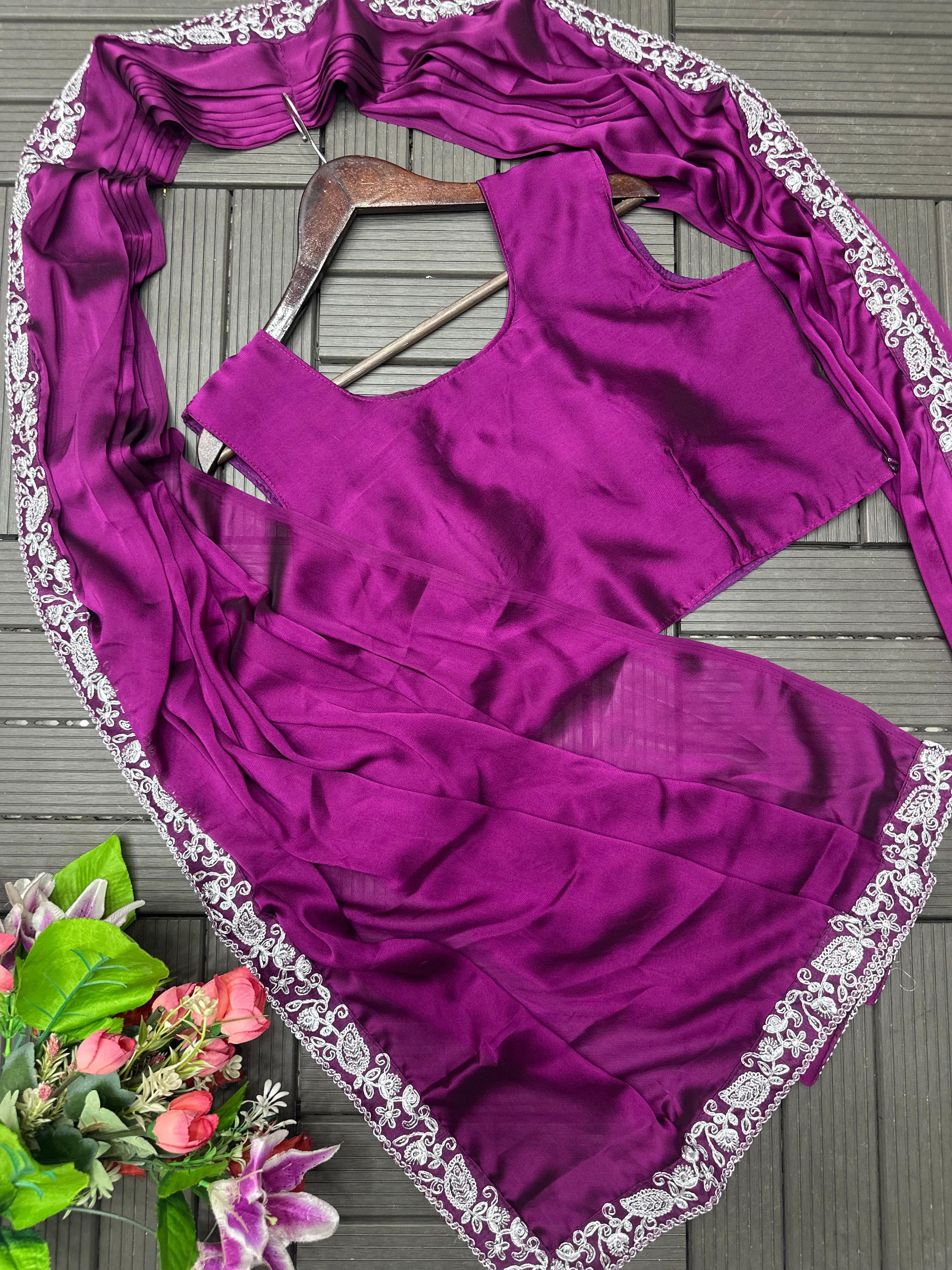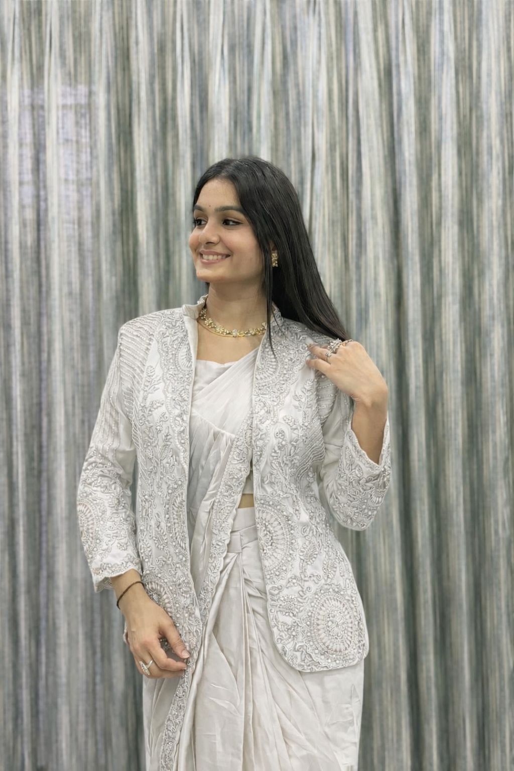 This super trending ready-to-wear saree is designed in heavy rangoli fabric with elegant embroidery sequence cording work. The set comes with a fully stitched koti jacket that adds a modern and classy touch to traditional saree styling. Comfortable, stylish, and easy to wear, it is perfect for parties, festive occasions, and special events.