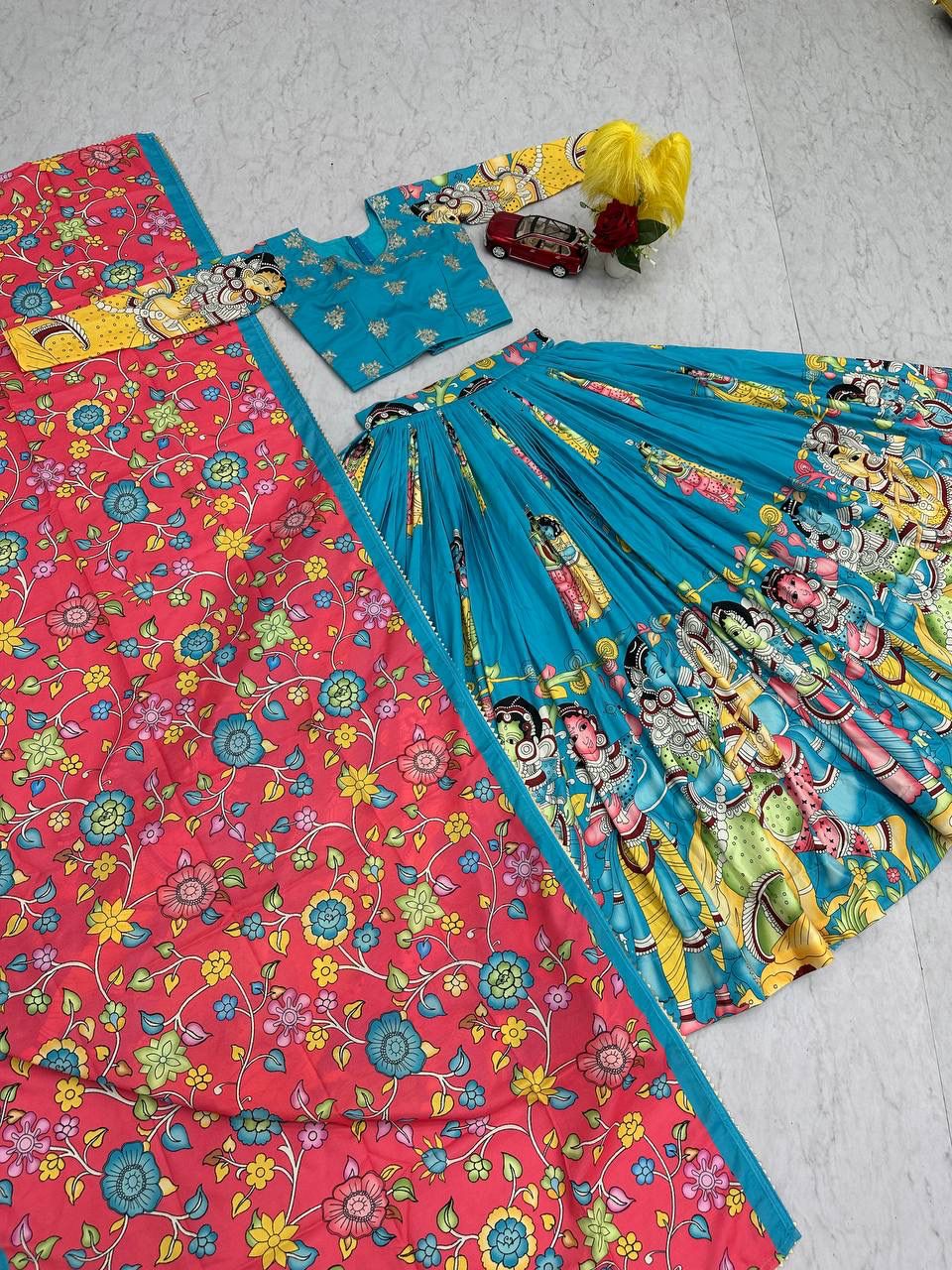 This Kalamkari lehenga choli set is crafted in soft and breathable Riyon cotton, offering both comfort and traditional elegance. The fully stitched choli features beautiful embroidery sequence work combined with Kalamkari print, while the lehenga comes with a graceful 3.50-meter flair for a rich festive look. Paired with a matching Riyon cotton dupatta, this set is perfect for festive occasions, functions, and cultural celebrations.