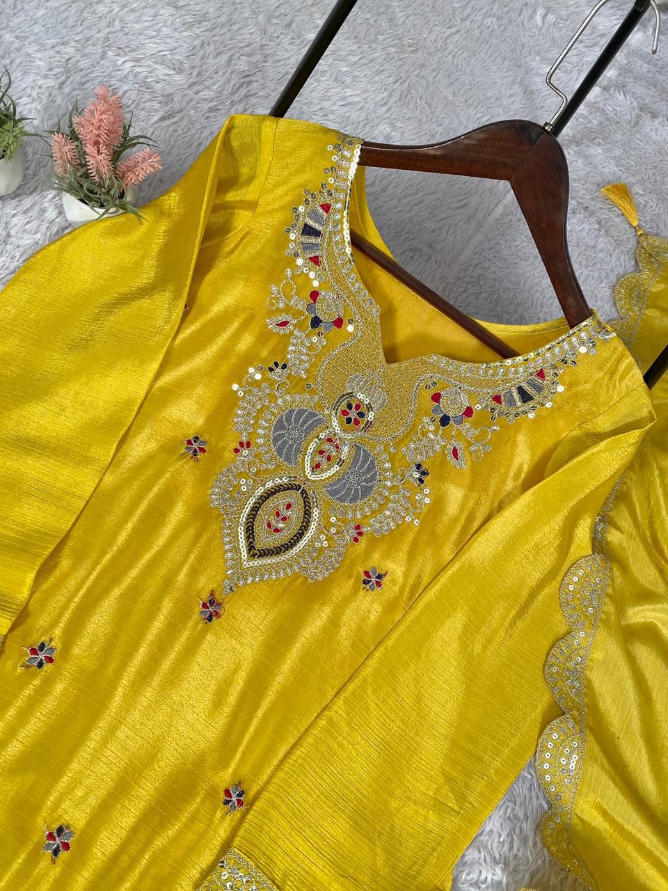 This exclusive wedding-season ethnic set features a beautifully sequence-embroidered top, plazzo, and dupatta crafted in premium Chinon fabric. The top comes with soft micro inner lining for comfort, while the matching plazzo and dupatta enhance the elegant festive look. Designed for weddings and special occasions, this set offers a perfect balance of style, comfort, and premium finishing.