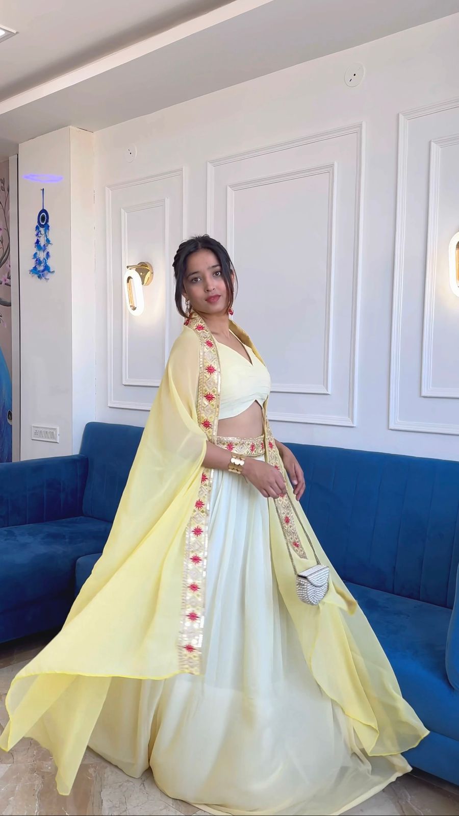 This stylish Indo-western lehenga set is crafted in premium georgette fabric, designed to give a trendy yet elegant festive look. The lehenga features thread, dori, and sequins work on the waist border with can-can attached for a graceful flare. It comes with an unstitched georgette blouse for custom fitting and a beautifully embroidered georgette koti with sequins, thread, and dori work. This is a real product modeling shoot, and you will receive the same product as shown.